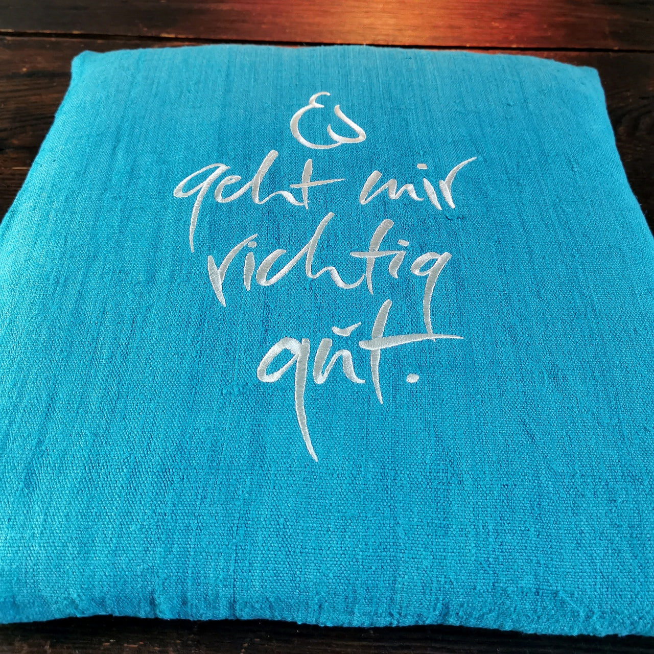 Details: Farbe: Helles Petrol Größe: 41 × 41 × 4 cm Material Hülle: 100 % handgewebtes, antikes Bauernleinen (vorgewaschen & gefärbt), mit Reißverschluss Stickerei: „Es geht mir richtig gut“ in Creme Füllung: Schweres Baumwoll-Innenkissen (nicht waschbar) Pflege: Hülle waschbar bei 40 °C (Schonwaschgang)