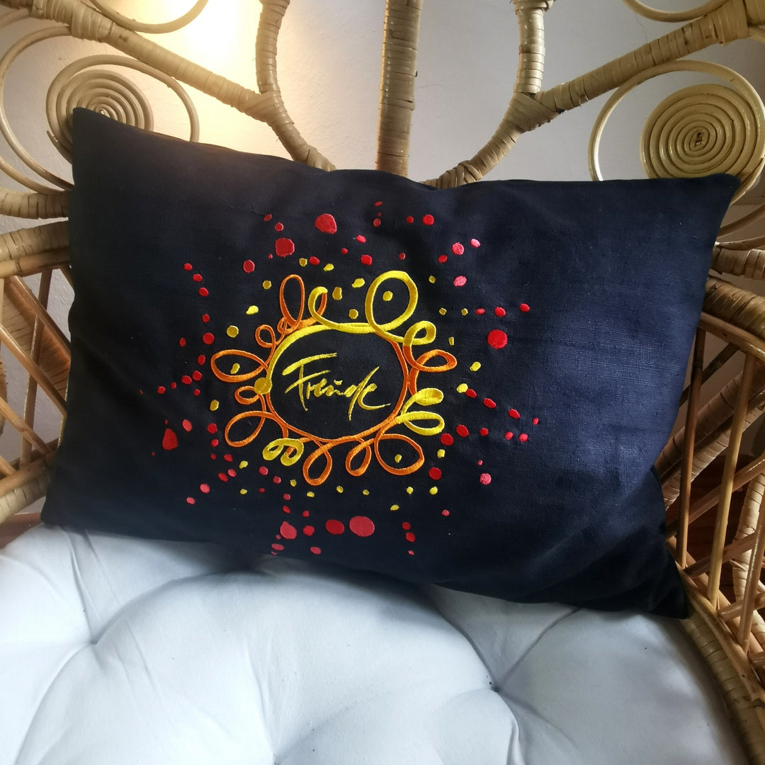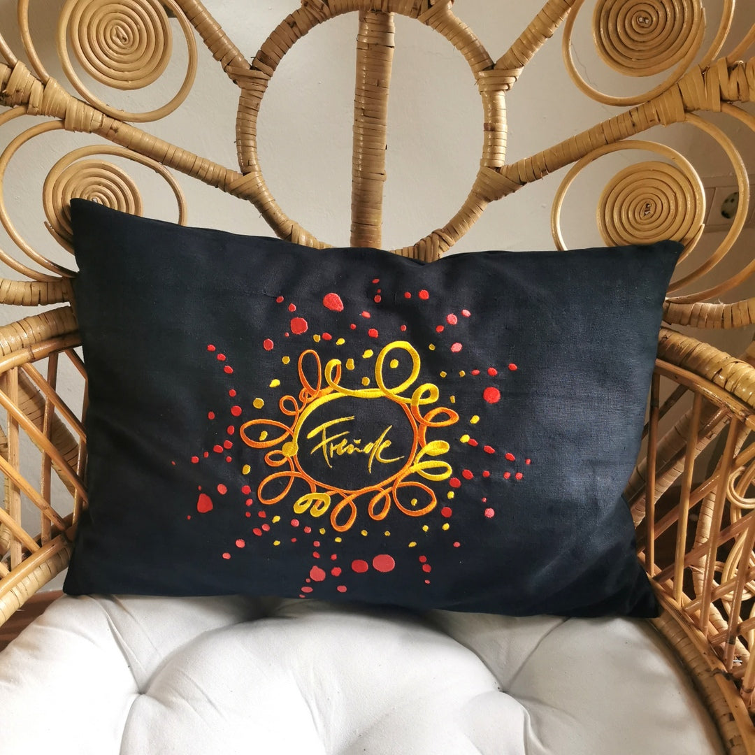 Maße: 50 × 35 cm Material Hülle: Handgewebtes, schwarz gefärbtes Bauernleinen Stickerei: „Freude / Ornament“ (Sign by Jwala®) im Gelb–Orange–Rot-Verlauf Füllung: Inlett mit reinen Zirbenholzflocken