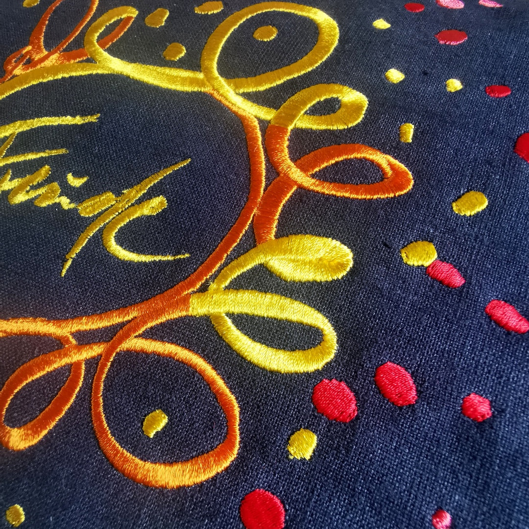Bringe mit diesem Sign-Seelenstück ein Stück Lebensfreude und natürlichen Duft in dein Zuhause. Die Hülle aus schwarz gefärbtem, handgewebtem Bauernleinen bildet einen eleganten Hintergrund für die leuchtende Stickerei „Freude / Ornament“ im Gelb–Orange–Rot-Verlauf – ein kraftvoller Akzent, der das Herz berührt und jeden Raum erhellt.