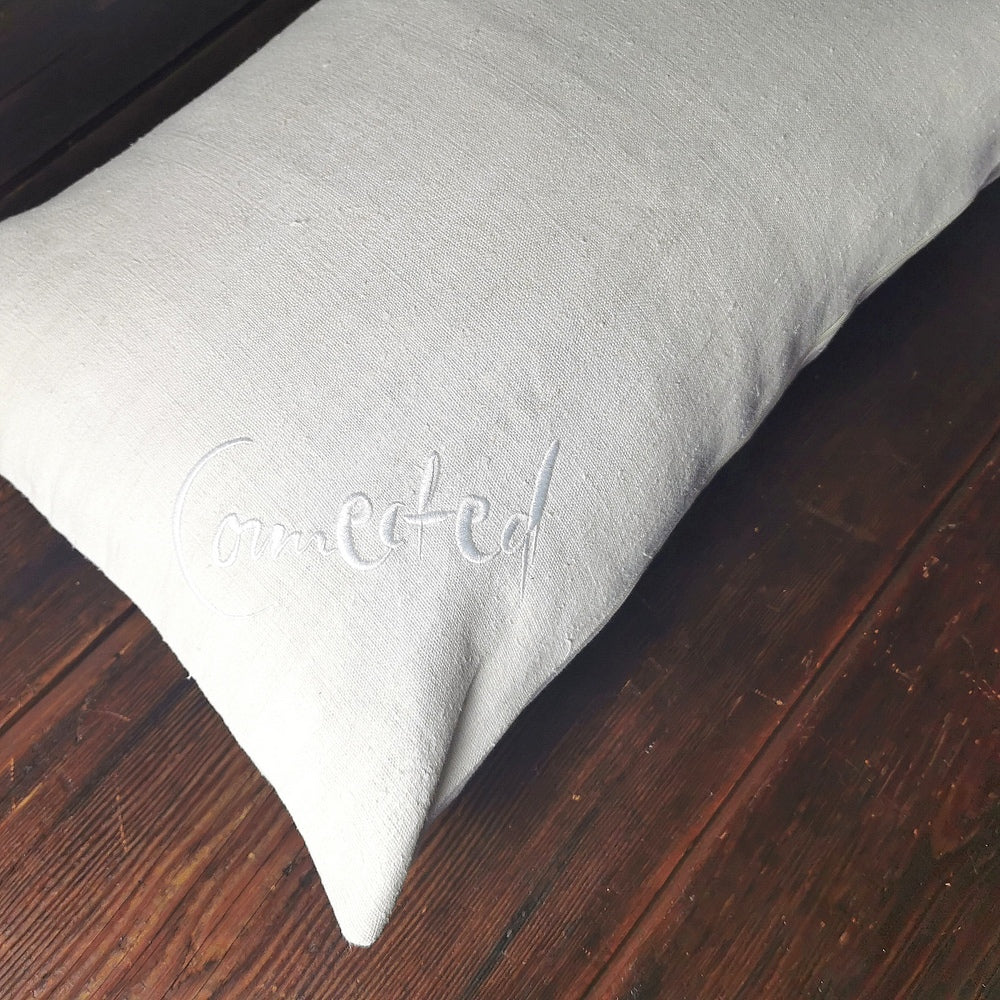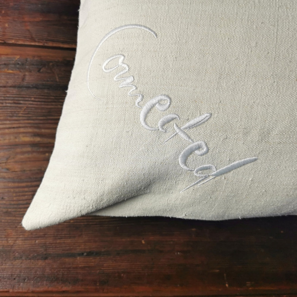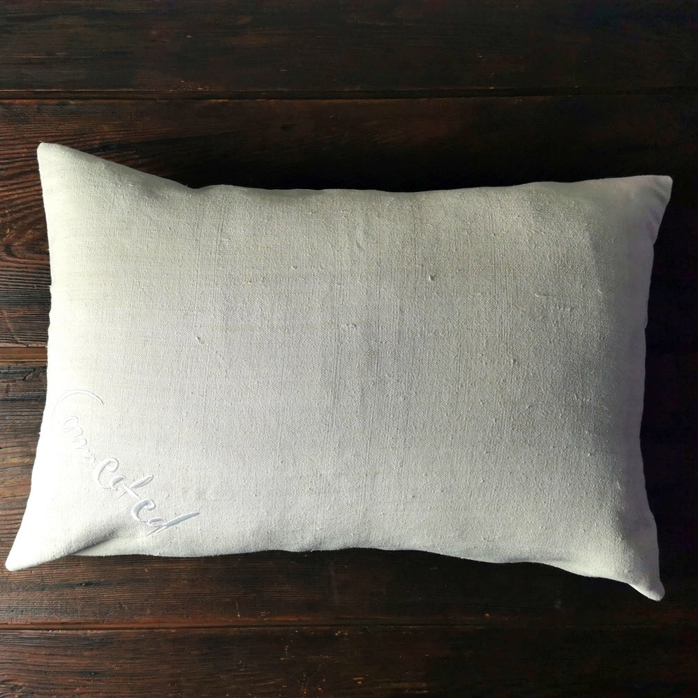 Besondere Kissenhülle aus antikem Bauernleinen mit inspirierender Botschaft – 60x40 cm, handgefertigt in Tirol
