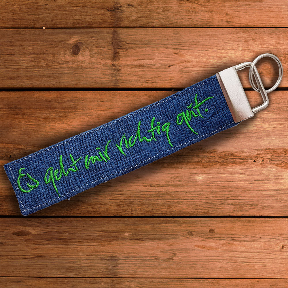 Ein Schlüsselerlebnis für jeden Tag – Handgemachter Schlüsselanhänger „Es geht mir richtig gut“ aus Bauernleinen