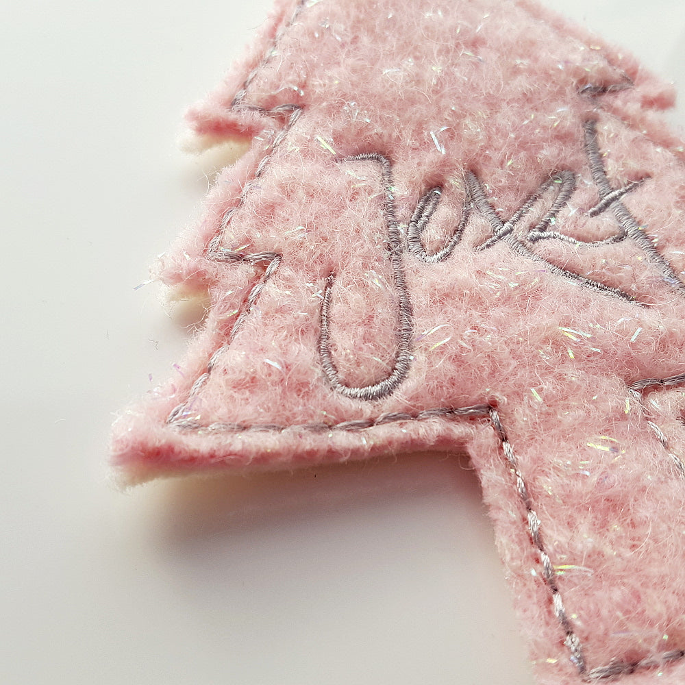Die Vorderseite glänzt in hellrosa Glitzer, die Rückseite ist in cremefarbenem Ton gehalten. Mit der cremefarbenen Papierschnur lässt sich der Baum-Anhänger ganz einfach an Baum, Tür oder Fenster dekorieren und setzt überall einen inspirierenden Akzent. Ein einzigartiger, handgemachter Schmuck für die festliche Zeit – ideal auch als Geschenk für Herzensmenschen!