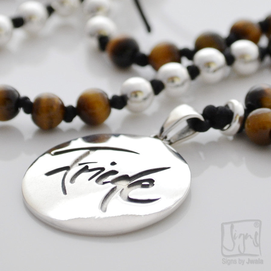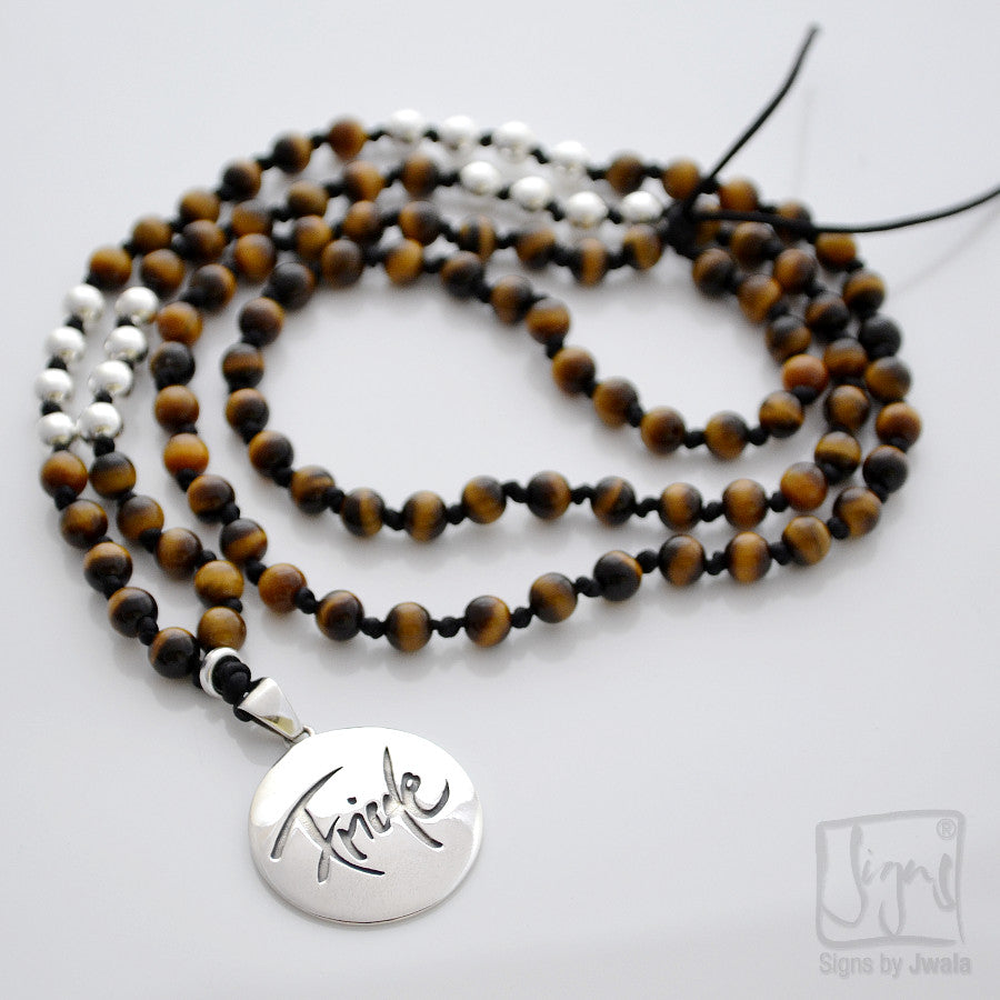 Diese Mala vereint die schützende und klärende Energie des Tigerauges, das Selbstvertrauen und innere Stärke fördert, mit dem Sign by Jwala "Friede", das für inneren und äußeren Frieden steht.