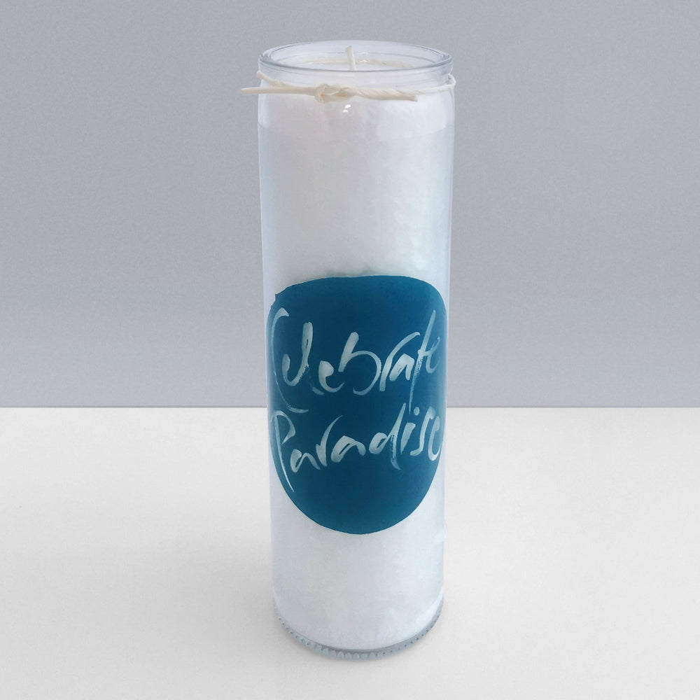 SignKerze „Celebrate Paradise“ – Nachhaltige Kerze mit inspirierender Botschaft & 100h Brenndauer