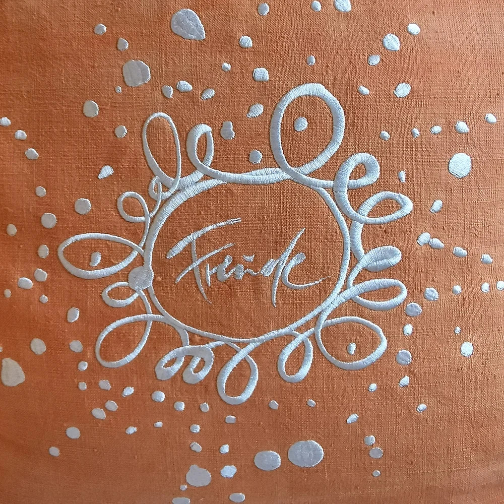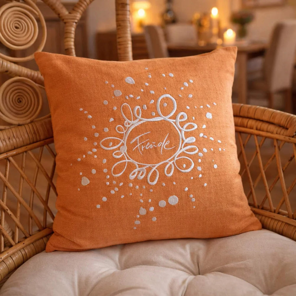 Die Hülle aushandgefärbtem Bauernleinen in lebendigem Orangebringt Wärme, Lebenskraft und neue Energie in dein Zuhause. Das aufgestickteSign „Freude / Ornament“ (Sign by Jwala®)incremefarbener Stickereierinnert daran, das Leben mit Leichtigkeit zu empfangen. Jeden Tag neu.