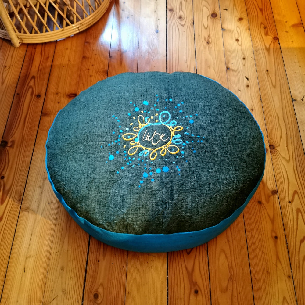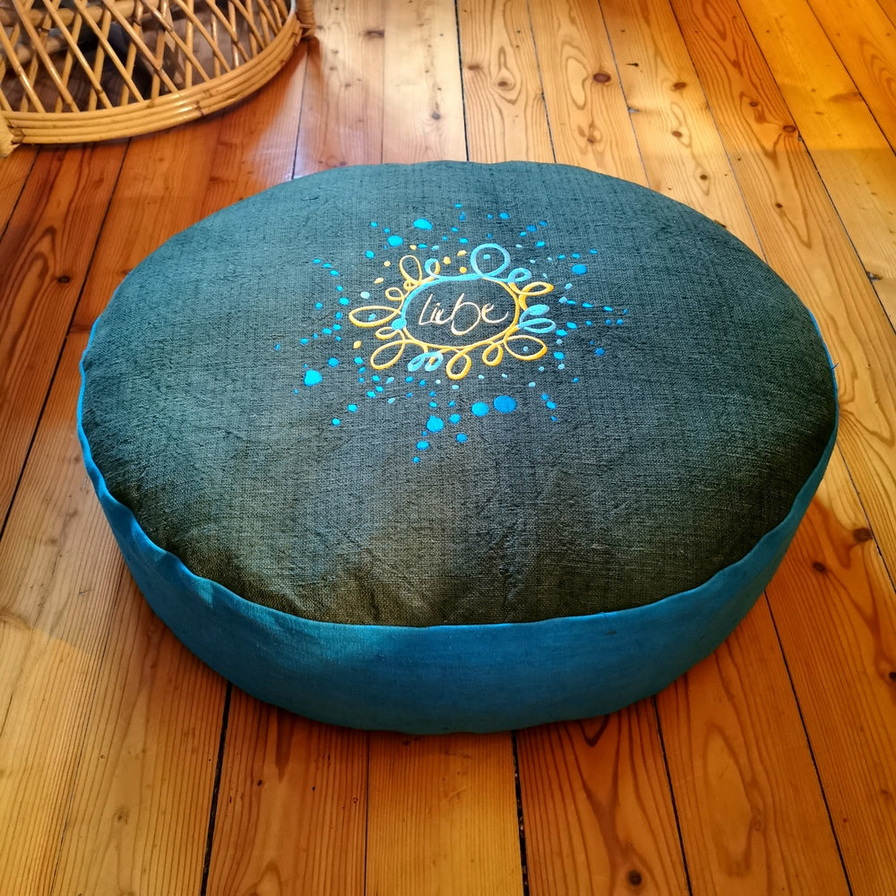 Das Innenkissen aus Baumwolle ist mit hochwertigem Bio-Dinkelspelz gefüllt, der individuell regulierbar ist. Der Dinkelspelz sorgt für natürliche Unterstützung und ein angenehmes Sitzgefühl – ideal für Meditation, Yoga, als Bodensitz oder einfach zum Entspannen. Dank des seitlichen Reißverschlusses kannst du die Füllmenge jederzeit anpassen. Die Ober- und Unterseite des Kissens sind in Tannengrün, die Seiten in Petrol handgefärbt – so entsteht ein harmonisches, modernes Farbspiel, das sich wunderbar in jedes Wohnambiente einfügt.