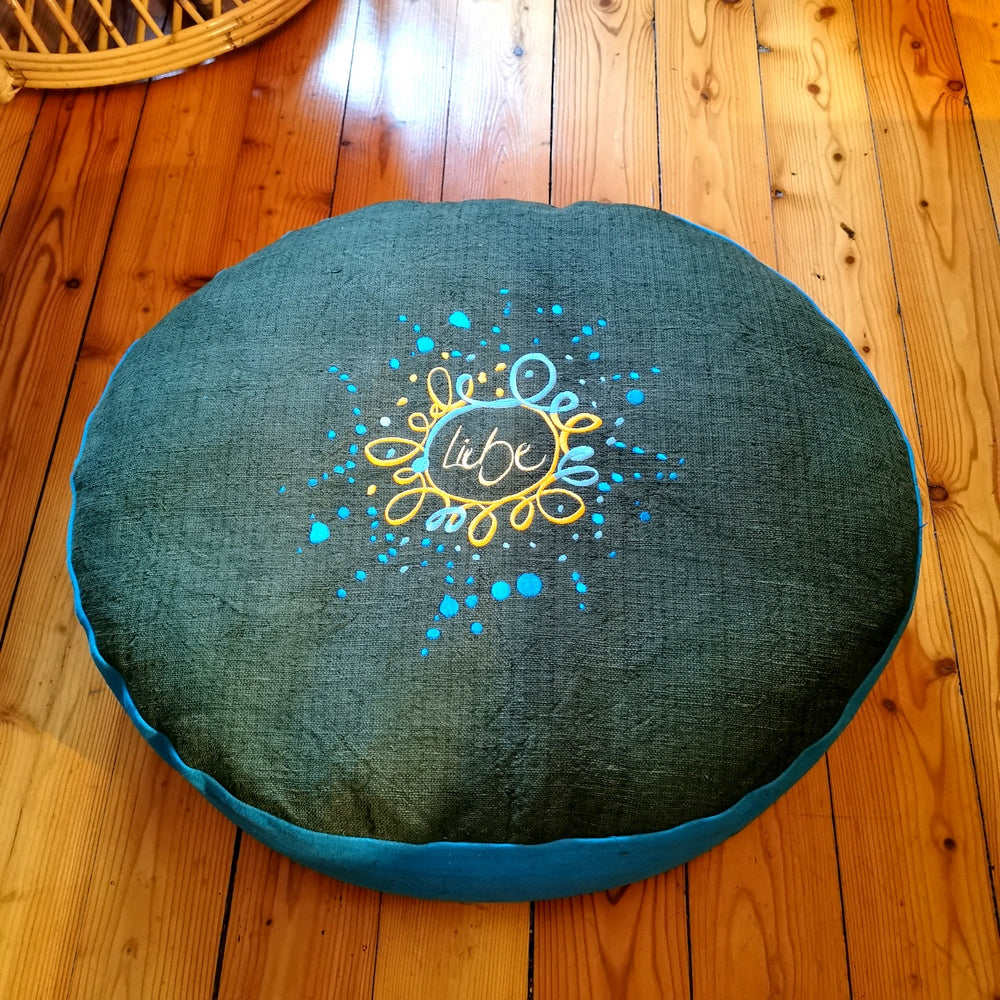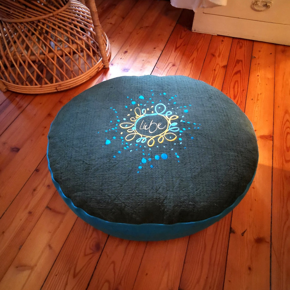 Erlebe pure Entspannung und stilvolle Inspiration mit diesem einzigartigen Bodenkissen aus 100% antikem, handgewebtem Bauernleinen – ein echtes Highlight für alle, die nach einem besonderen, handgemachten Sitzkissen mit inspirierender Botschaft suchen. Jedes Kissen wird in Tirol liebevoll bestickt und genäht, wodurch jedes Stück zu einem unverwechselbaren Unikat wird. Die kunstvolle Stickerei „Liebe/Ornament“ (Sign by Jwala®) in Petrol, Mint und Gelb macht dieses Bodenkissen zu einem echten Blickfang und bringt Herzenswärme in jeden Raum.