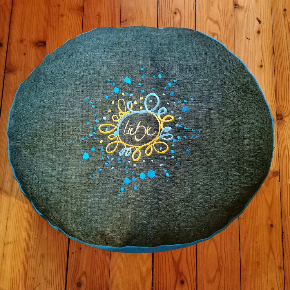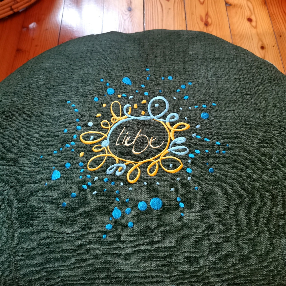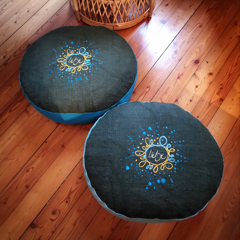 Geliefert wird das Bodenkissen in einem eigens dafür handgenähten Baumwollsack, der das Kissen schützt und stilvoll aufbewahrt. Die limitierte und nummerierte Auflage von nur 11 Stück macht dieses Kissen zu einem exklusiven Sammlerstück für alle, die Wert auf nachhaltige Handwerkskunst, natürliche Materialien und liebevolle Botschaften legen.