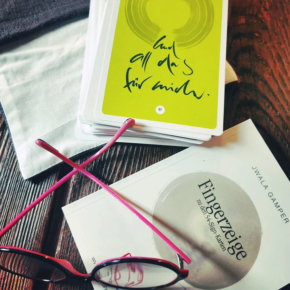 Die 54 Sign-Karten mit dem Buch "Fingerzeige" von Jwala Gamper sind ein Erfolgsfächer für ein gut gelebtes Leben.