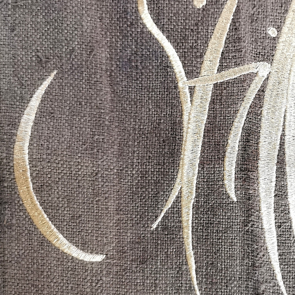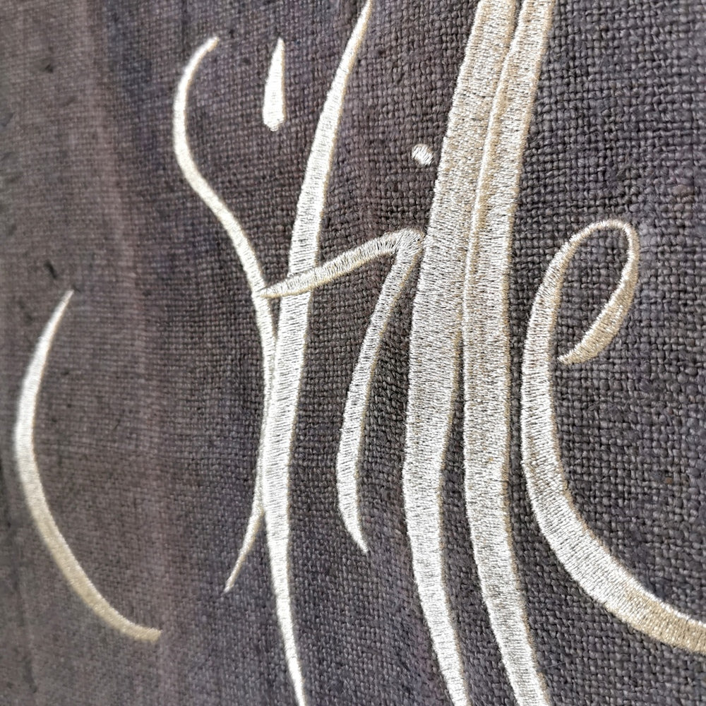 Gefertigt aus mittelgrobem, handgewebtem Vintage-Bauernleinen, das in der Claudiaschlössl-Manufaktur sorgfältig vorgewaschen und handgefärbt wurde, vereint dieser Wandteppich traditionelle Qualität mit moderner Spiritualität. Die edle Silber/Lurex-Stickerei bringt das Sign „Stille“ auf einzigartige Weise zur Geltung und macht jedes Exemplar zu einem exklusiven Unikat. Mit nur 13 Stück weltweit ist dieser Haussegen ein echtes Sammlerstück – ideal für alle, die einen besonderen Akzent der Ruhe und Kraft in ihren Räumen setzen möchten.