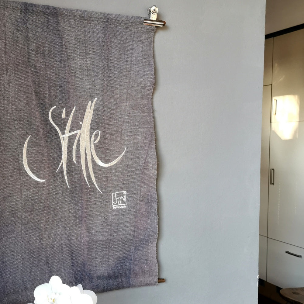 Sign-Haussegen „Stille“ – Wandteppich aus handgewebtem Vintage-Bauernleinen
