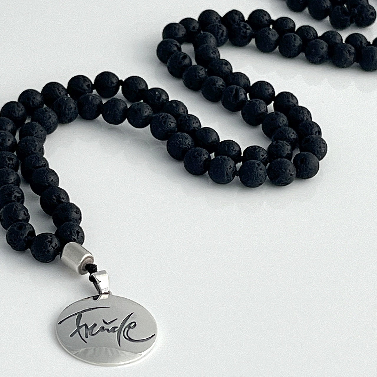 Details: • 108 Perlen aus schwarzem Lavastein (8 mm) • Guru-Perle aus 925er Sterlingsilber • Amulett: Freude – Sign by Jwala® • Einfache Länge (inkl. Amulett): ca. 50 cm • Verpackt im hochwertigen Bauernleinen-Täschchen mit Satinschleife