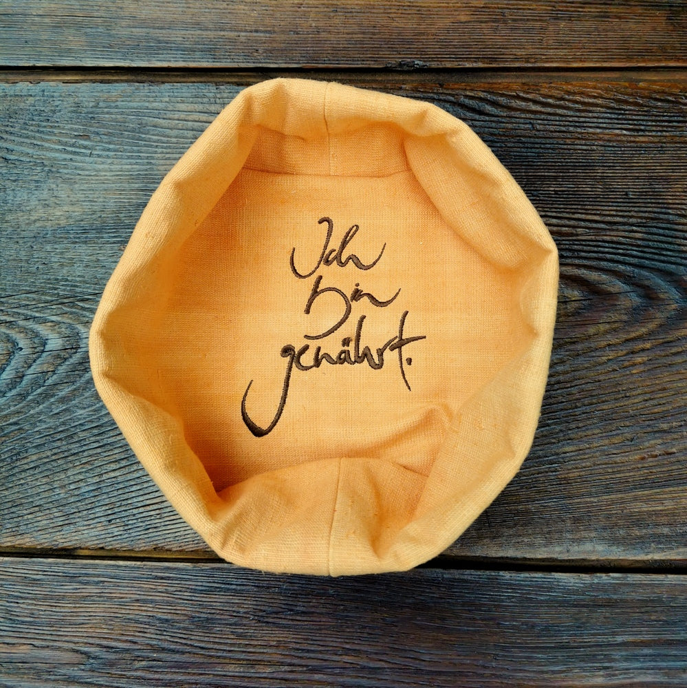 Bereichere deinen Esstisch mit dem einzigartigen Brotkörbchen „Ich bin genährt“ aus handgewebtem, antikem Bauernleinen – liebevoll gefertigt in der Claudiaschlössl-Manufaktur in Tirol. Die edle Stickerei „Ich bin genährt“ (Sign by Jwala®) in Silber auf dem Boden des Körbchens macht jedes Stück zu einer täglichen Inspiration für achtsames Genießen und echte Wertschätzung. Das über 100 Jahre alte, handgefärbte Leinen und die limitierte Kleinserie machen dieses Brotkörbchen zu einem besonderen Geschenk und einem echten Schmuckstück für deine Tischkultur.
