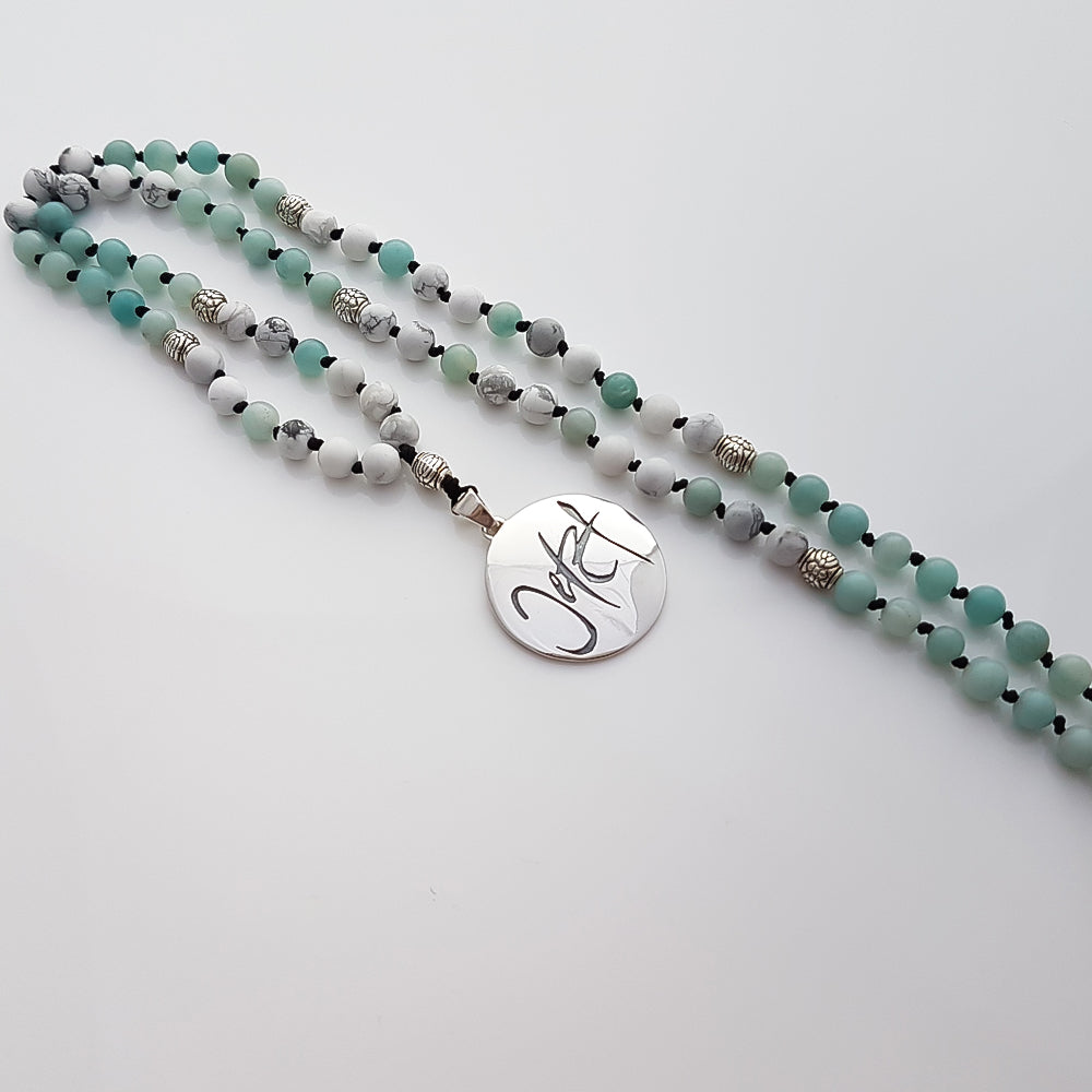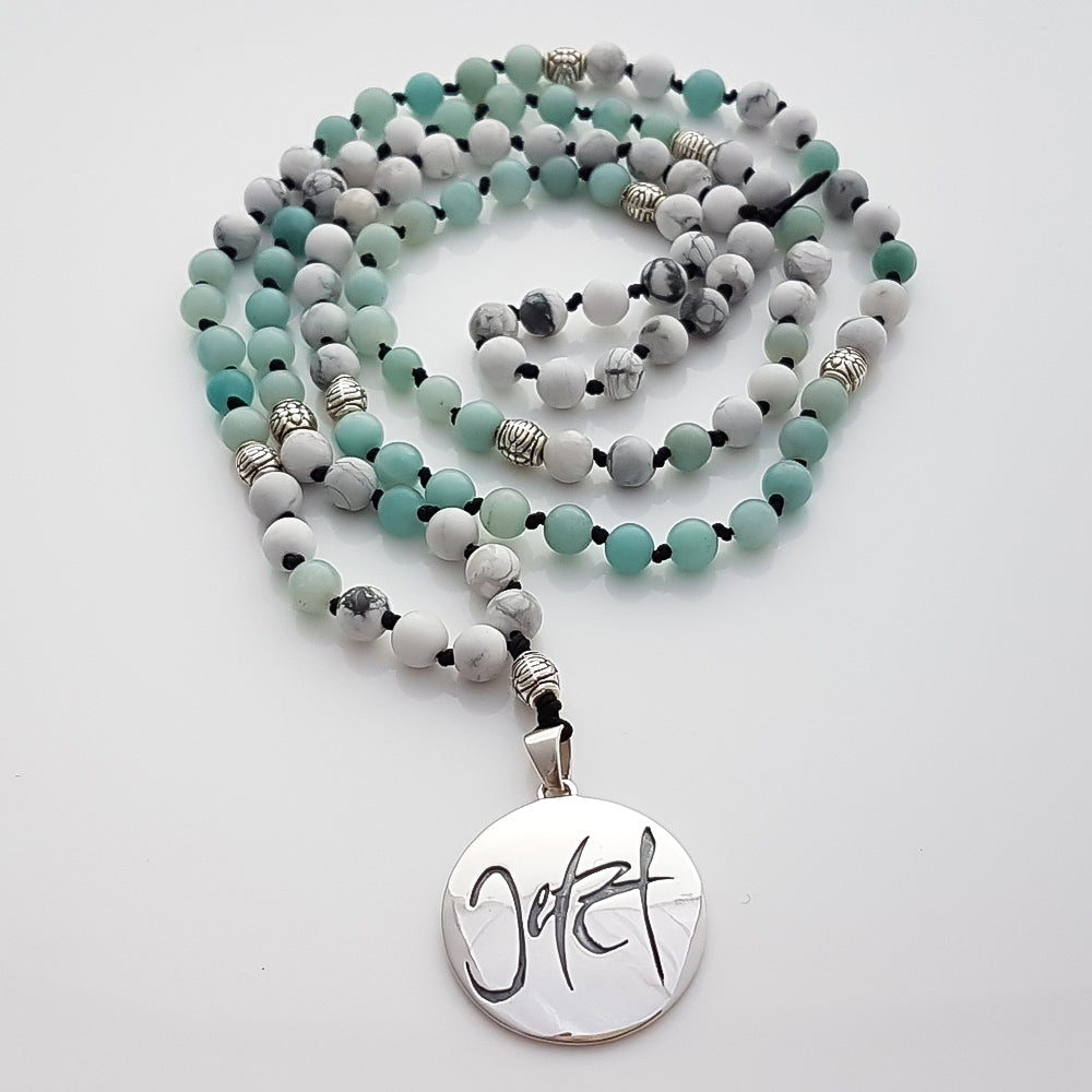 Erlebe die besondere Energie einer handgeknüpften Mala, die mit viel Liebe, Geduld und Sorgfalt gefertigt wird. Jede der 108 Halbedelsteinperlen – zum Beispiel Howlith oder Amazonit – ist einzeln von Hand geknotet, wodurch die Kette nicht nur besonders haltbar, sondern auch einzigartig in ihrer Ausstrahlung wird. Die edlen Zwischenperlen und das Medaillon „Jetzt“ (Sign by Jwala®) sind aus 925er Sterlingsilber gefertigt und verleihen deiner Mala einen ganz besonderen Glanz.
