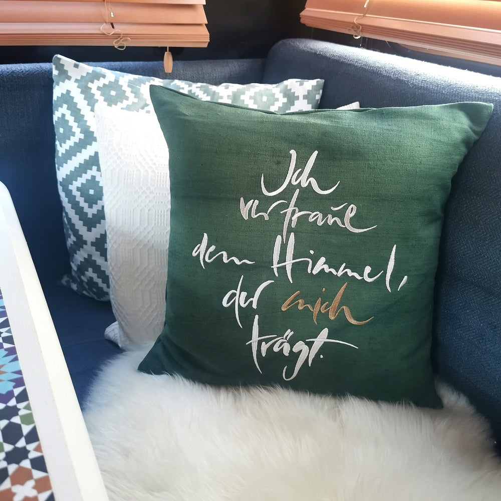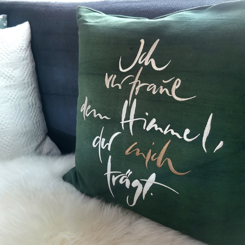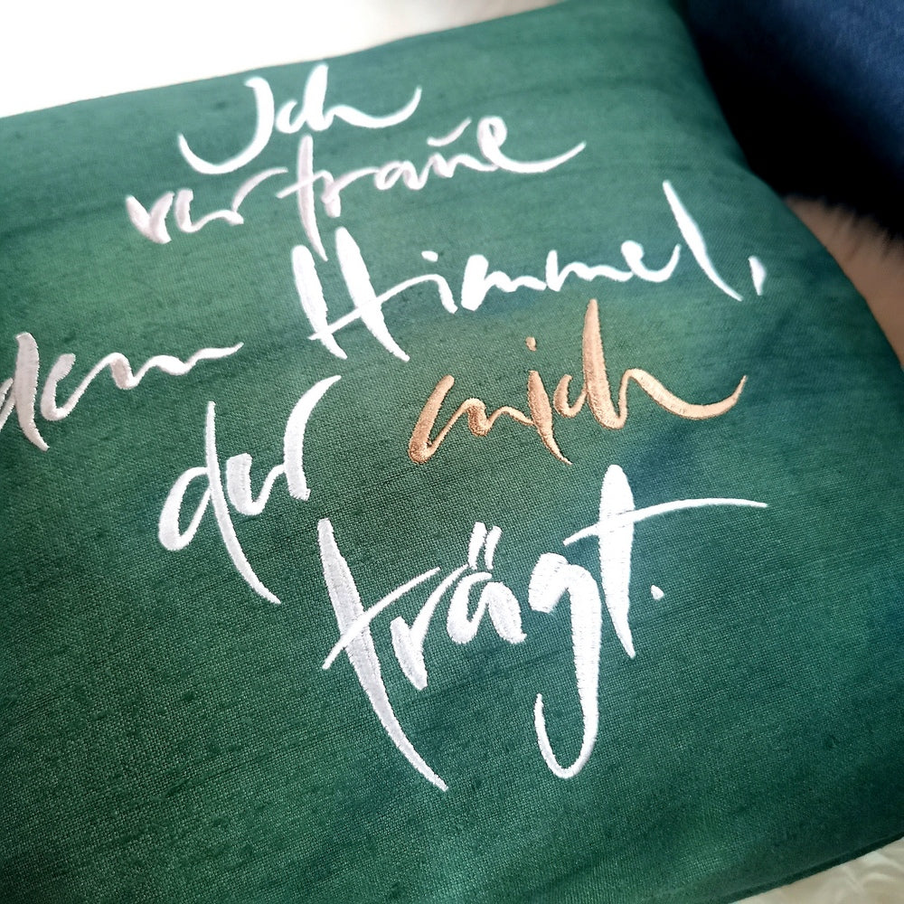 Dekokissenhülle „Ich vertraue dem Himmel, der mich trägt“ aus antikem Bauernleinen – 40x40 cm, handbestickt & limitiert