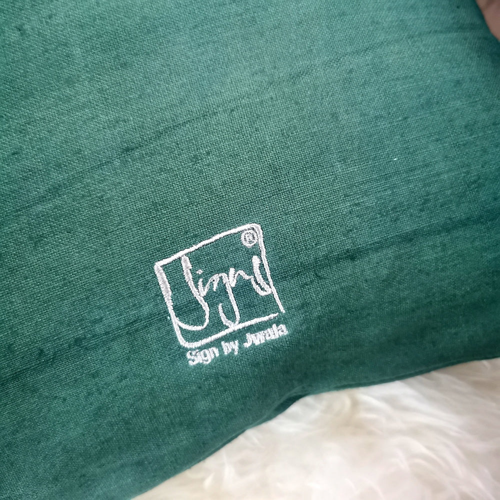 Jede Kissenhülle wird aus einem kleinen, einzigartigen Ballen antiken, handgewebten Leinens gefertigt, von uns sorgfältig gereinigt, gefärbt, genäht und kunstvoll bestickt. Die natürliche Leinenfaser ist robust, langlebig, atmungsaktiv und sorgt für ein angenehm kühles Gefühl – perfekt als nachhaltiges Wohnaccessoire oder Herzensgeschenk. Kleine Unregelmäßigkeiten im Gewebe sind sichtbare Zeichen echter Handarbeit und machen jedes Stück zum Einzelstück.