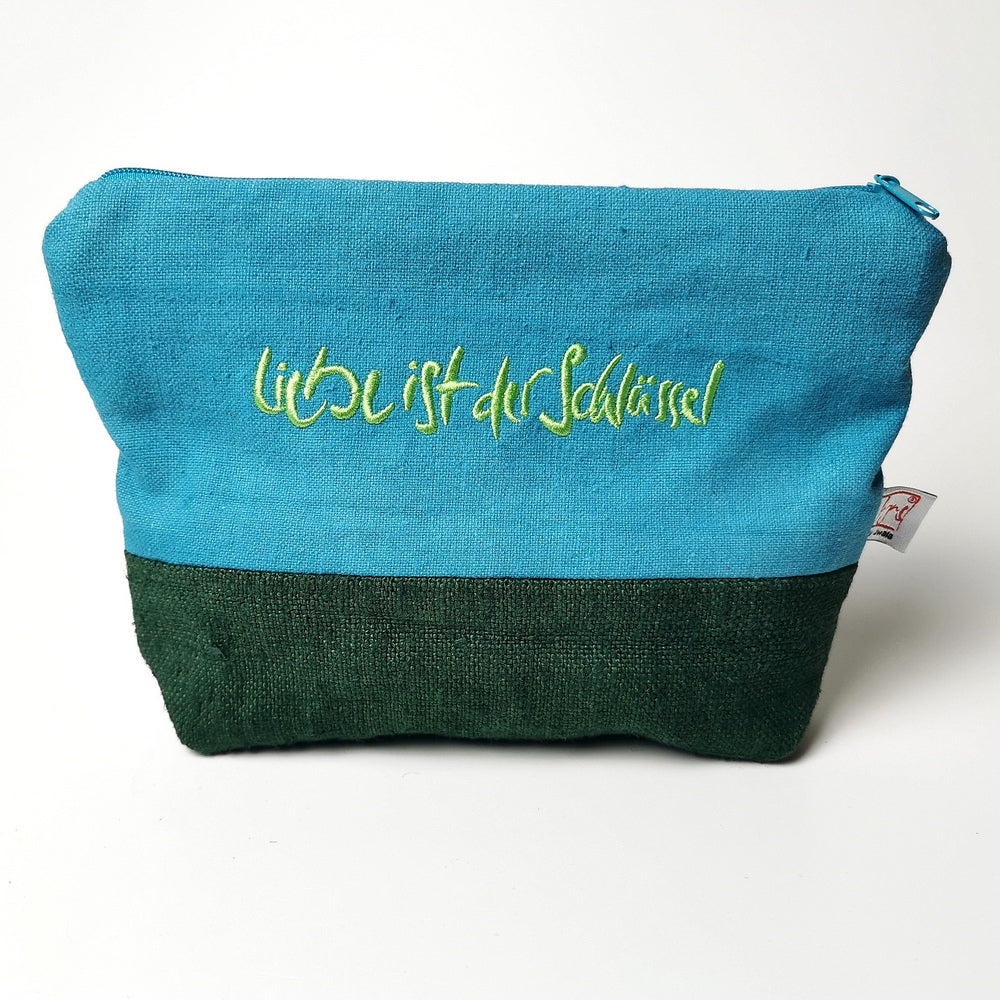 Handgemachtes Kosmetiktäschchen – „Liebe ist der Schlüssel“ aus Bauernleinen
