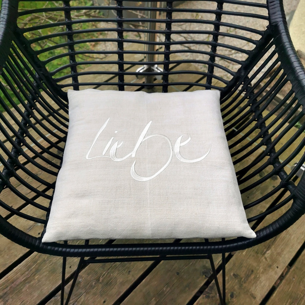 Handgefertigtes Flachkissen aus Vintage-Bauernleinen mit „Liebe“-Stickerei – limitiert & einzigartig