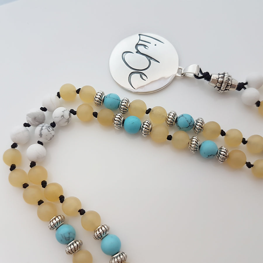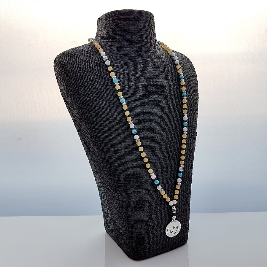 Diese Mala vereint die beruhigende, stresslindernde Wirkung des Howliths, die heilende und kommunikationsfördernde Energie des Türkis sowie die ausgleichende, optimistische Kraft der Gelben Jade. In Kombination mit dem Sign by Jwala "Liebe", das bedingungslose Liebe und Harmonie verkörpert, ist sie ideal für Menschen, die innere Ruhe, emotionale Heilung und mehr Freude in ihren Beziehungen suchen.