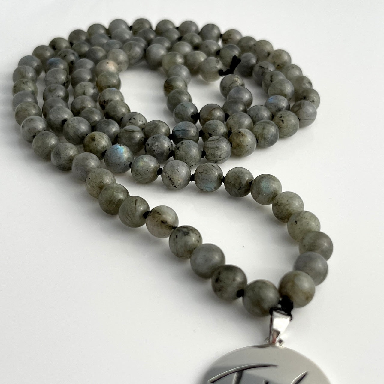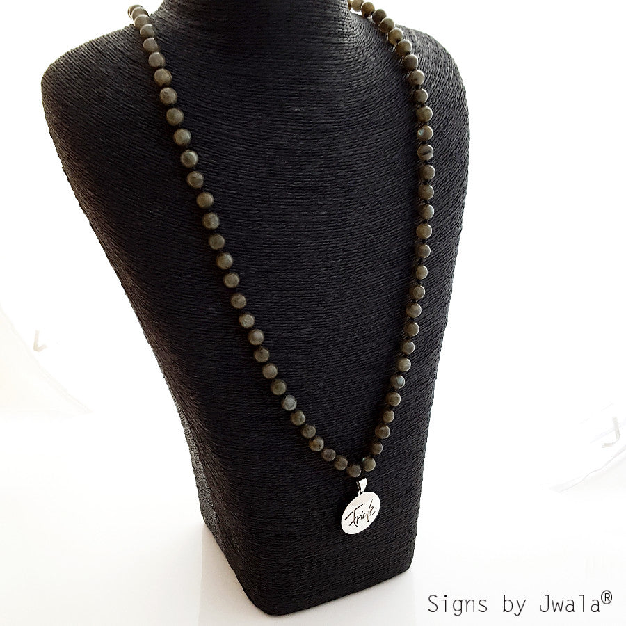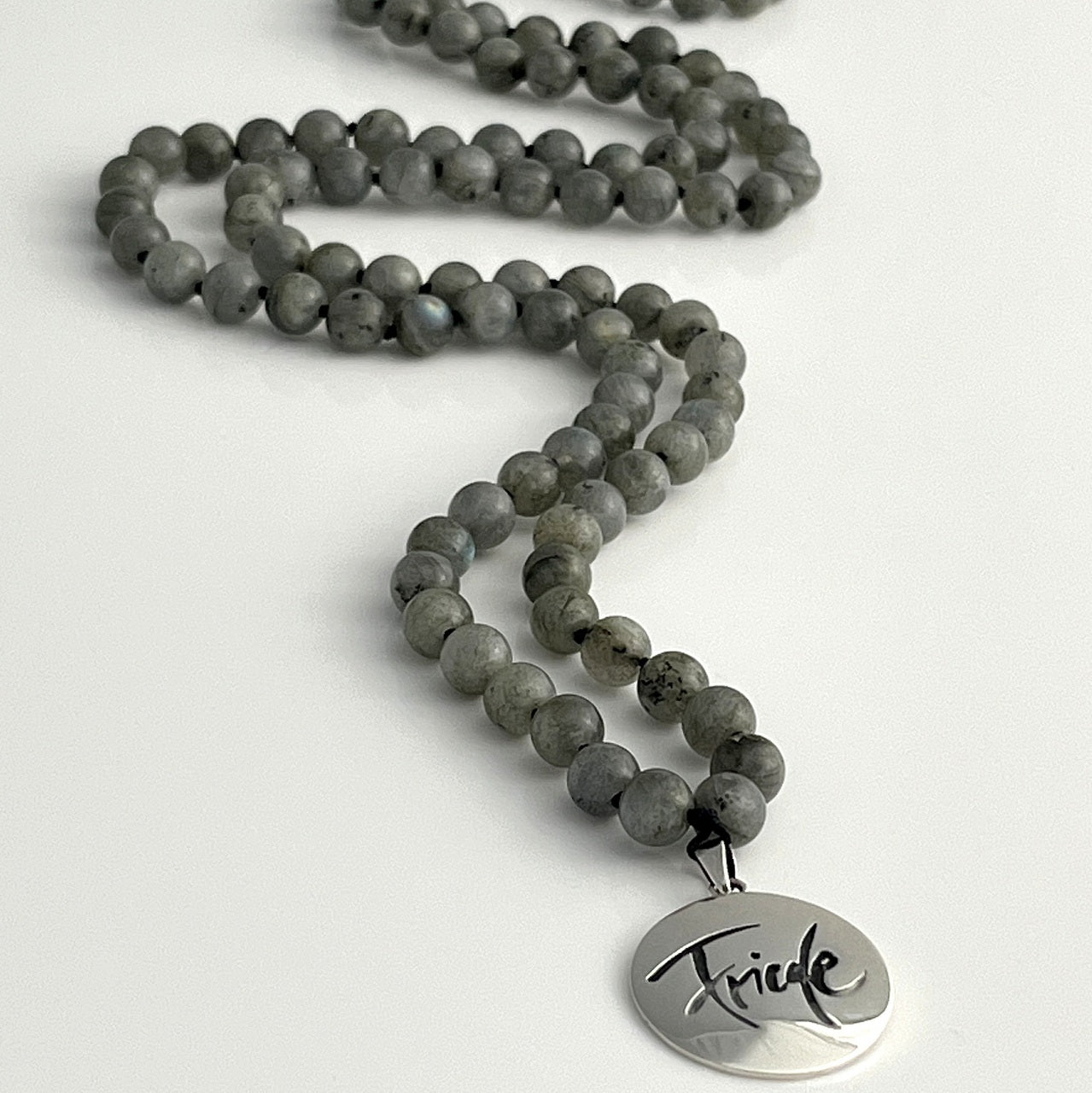 Details: • 108 Halbedelsteinperlen aus Labradorit • Perlengröße: 8 mm • Amulett: Friede – Sign by Jwala® aus 925er Sterlingsilber • Einfache Länge (inkl. Amulett): ca. 50 cm • Verpackung: In einem hochwertigen Täschchen aus 100 % Wollwalk mit Satinschleife