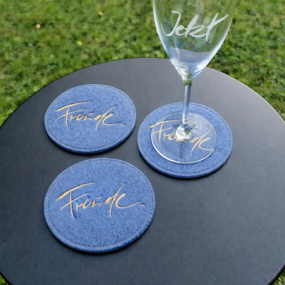 Unsere Glasuntersetzer „Freude“ sind feine Sign-Seelenstücke – gefertigt aus 100 % Wollwalk von Giesswein/Tirol und liebevoll bestickt mit dem Sign „Freude“ (Sign by Jwala®).