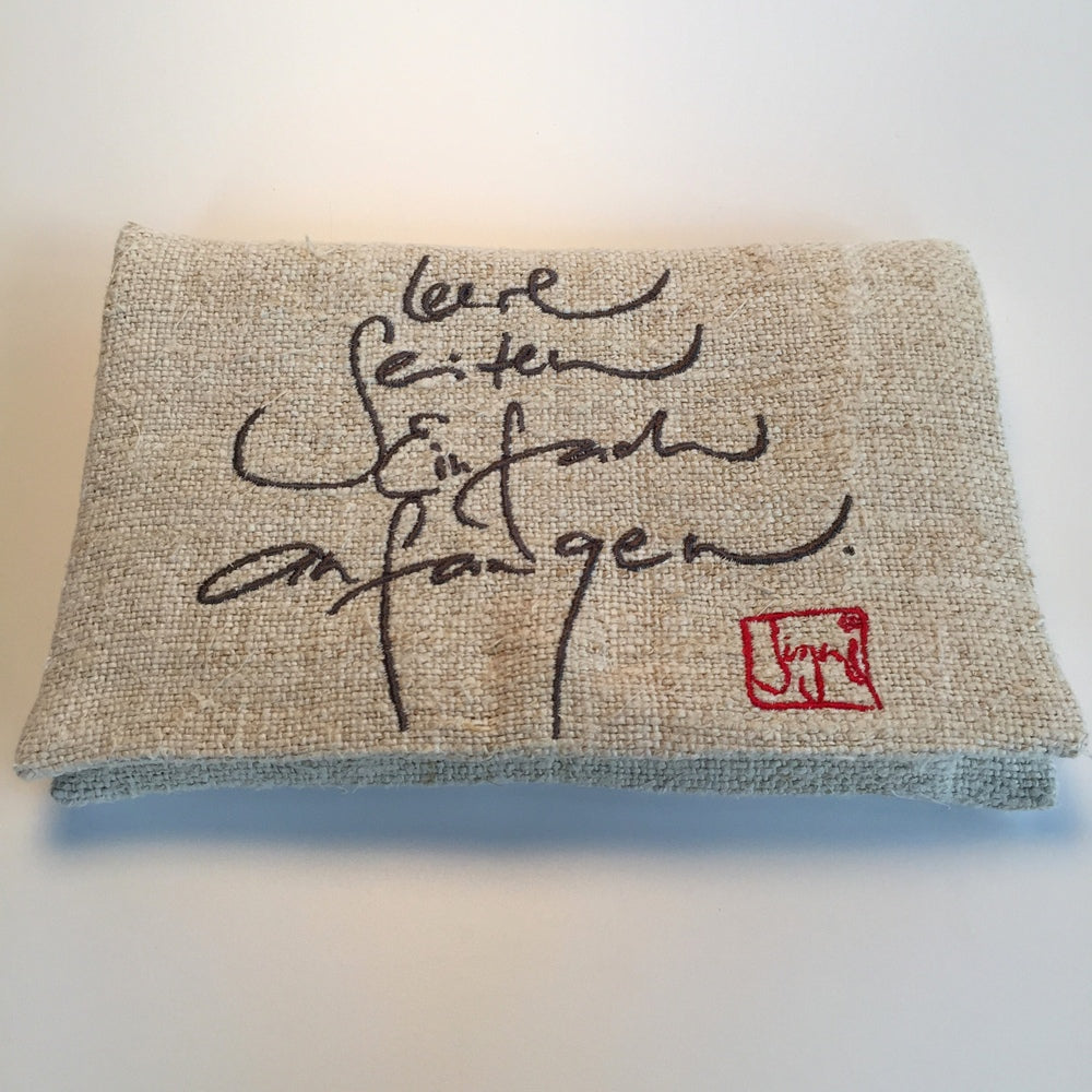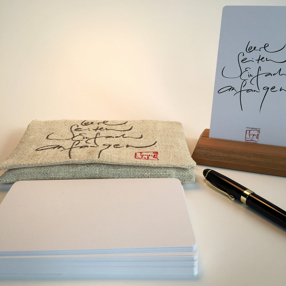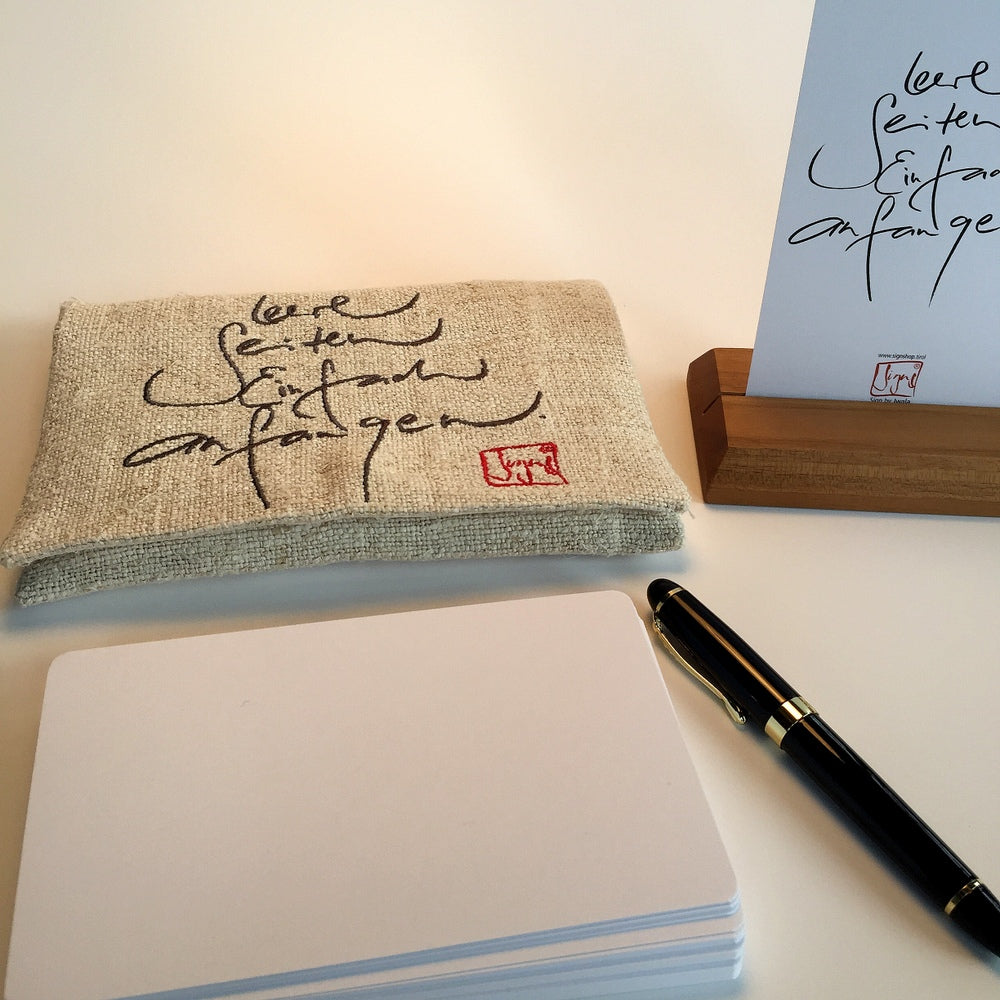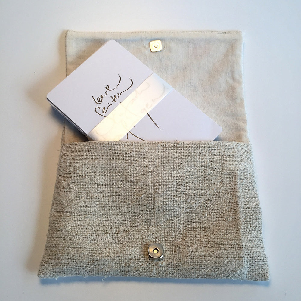 Fünfzig hochweiße Karten mit sanft abgerundeten Ecken – eingehüllt in eine bestickte, handgewebte Bauernleinentasche.