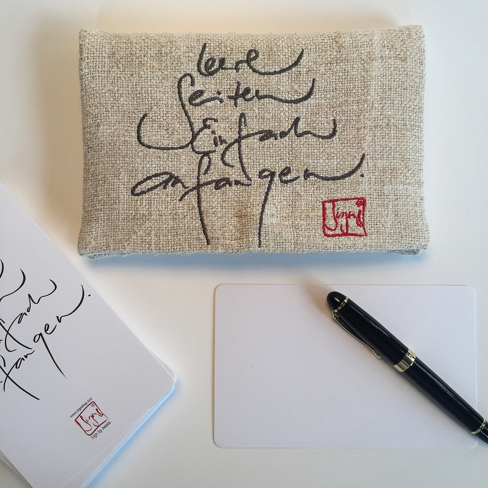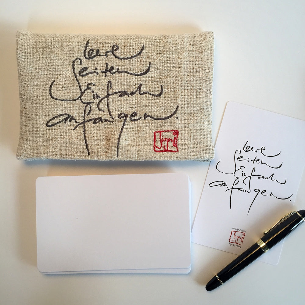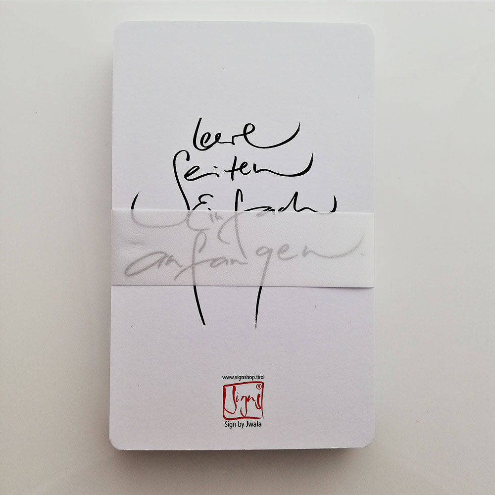 Deckkarte mit Sign „Leere Seiten. Einfach anfangen.“ und Anleitung auf der Rückseite