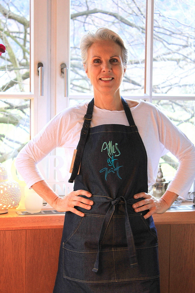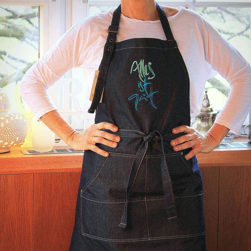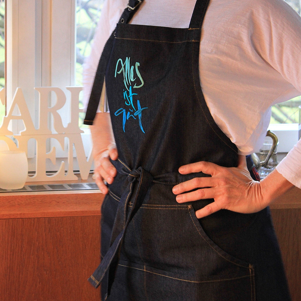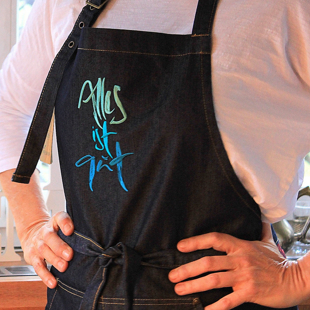 Entdecke die hochwertige Jeansschürze „Alles ist gut“: Stylisch, langlebig, mit besticktem Sign – perfekter Schutz und Komfort beim Kochen, Backen & Grillen!