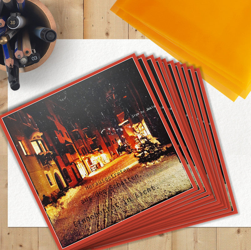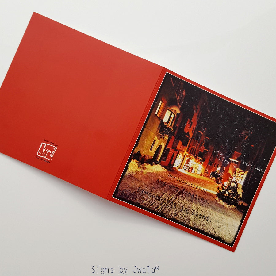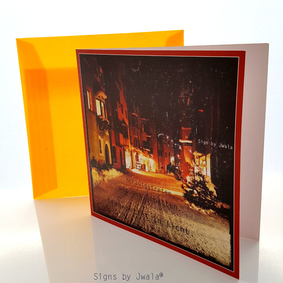 Verschenke mit dem Klappkarten-Set „Herausgetreten aus dem Schatten“ außergewöhnliche Herzensbotschaften, die weit über die stille Zeit hinausgehen. Jede der 10 Karten ist auf hochwertigem, mattem Papier gedruckt und trägt das inspirierende Sign by Jwala®: „Herausgetreten aus dem Schatten. Eingebettet in das Licht.“ Das stimmungsvolle Foto von Jwala Gamper aus Rattenberg/Tirol unterstreicht die Tiefe und Wärme dieser Karten. Mit den transparenten, orangefarbenen Kuverts werden deine Grüße zu einem besonderen Erlebnis für Herzensmenschen, die außergewöhnliche und spirituelle Klappkarten suchen. Ideal zum Verschenken, als Mutmacher oder für persönliche Botschaften voller Licht.