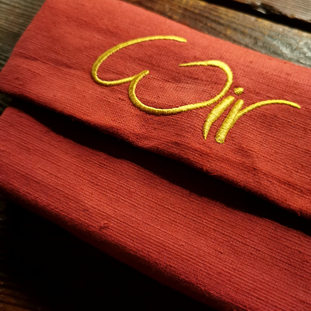 - WIR-Tasche aus handgewebtem und selbstgefärbten Vintage-Bauernleinen in Marsalarot mit Futter in Hellrot, bestickt in Curry (mit Magnetverschluss)